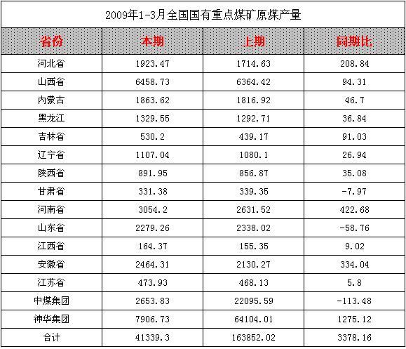 2009年1-3月全國國有重點(diǎn)煤礦原煤產(chǎn)量