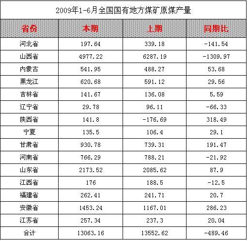 2009年1-6月全國國有地方煤礦原煤產(chǎn)量統(tǒng)計