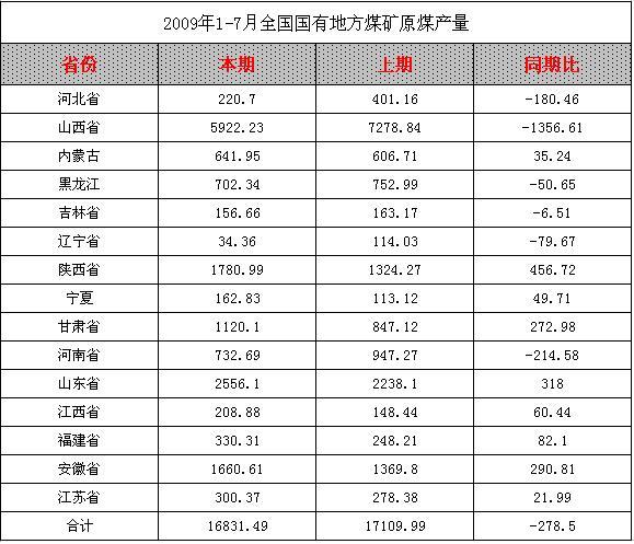 2009年1-7月全國國有地方煤礦原煤產(chǎn)量統(tǒng)計(jì)